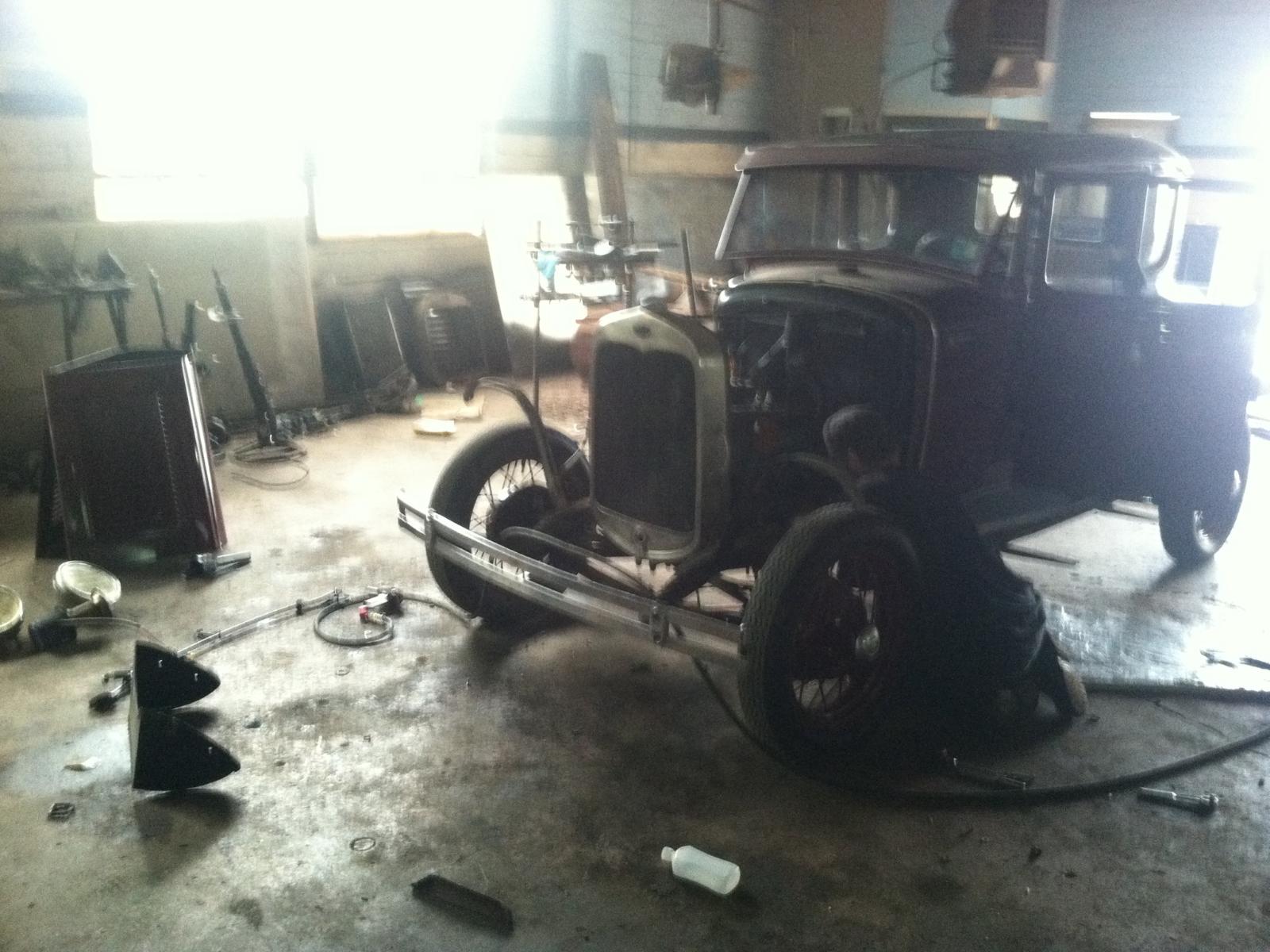 Since the 1930 Ford Model A coupe failed to sell on Ebay twice, it’s become the latest project car at Morbid Rodz.  Here’s a couple pictures of the carnage as it comes apart.  As someone on Facebook said earlier, Anybody can restore an antique but it takes a real man to cut one up.