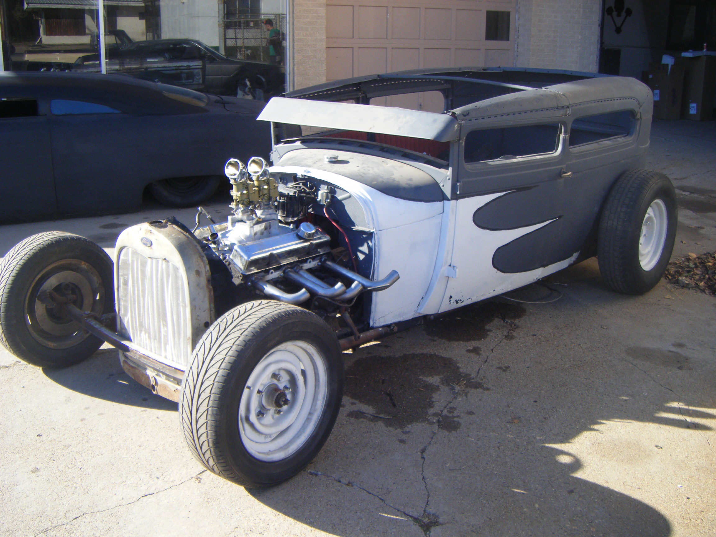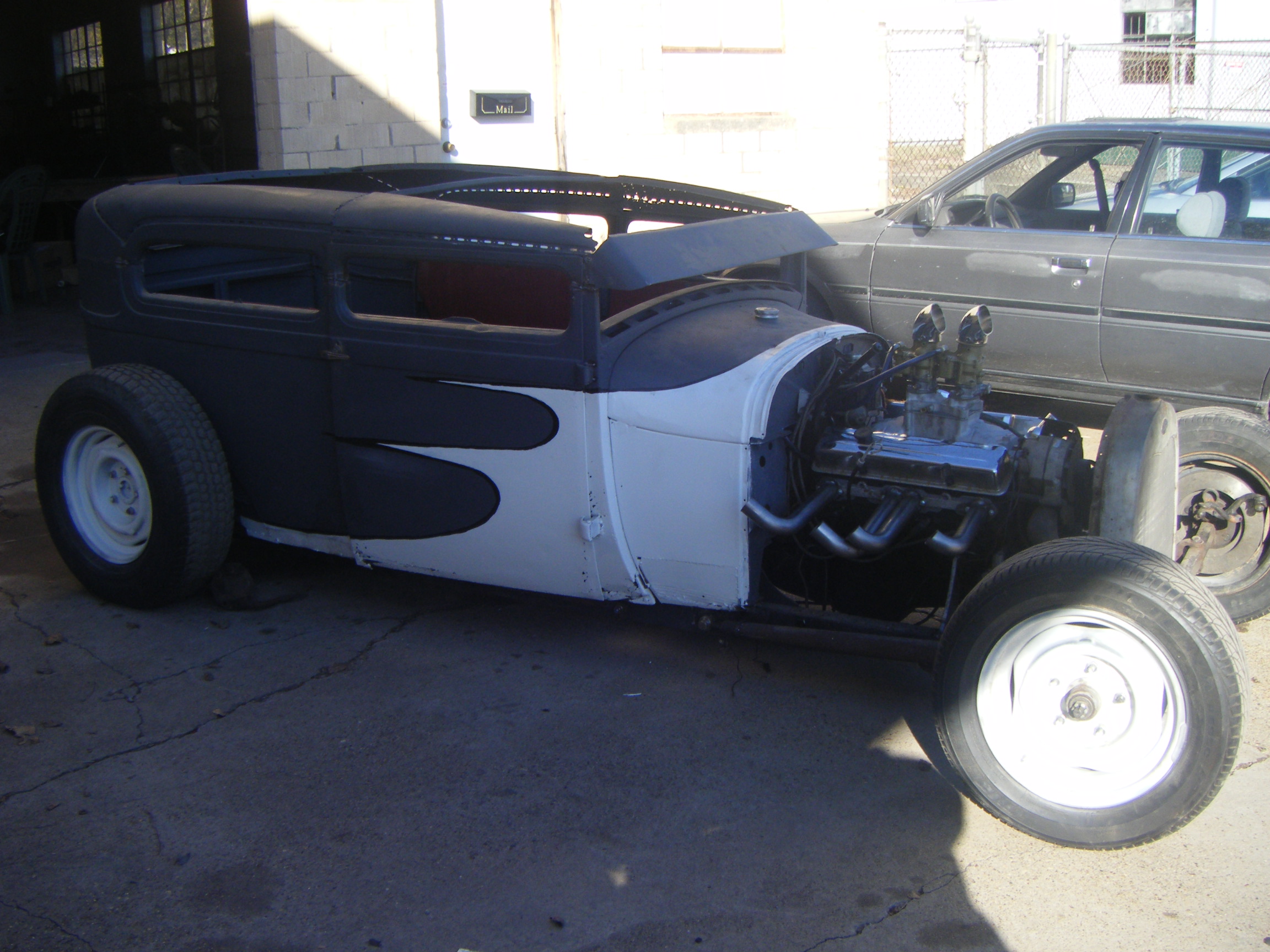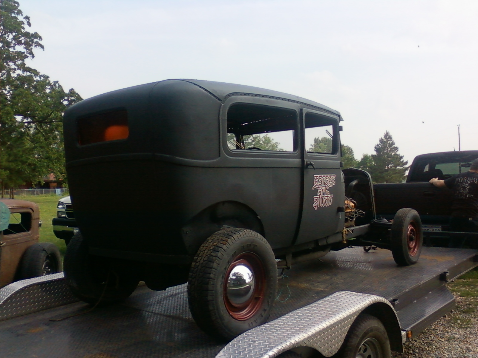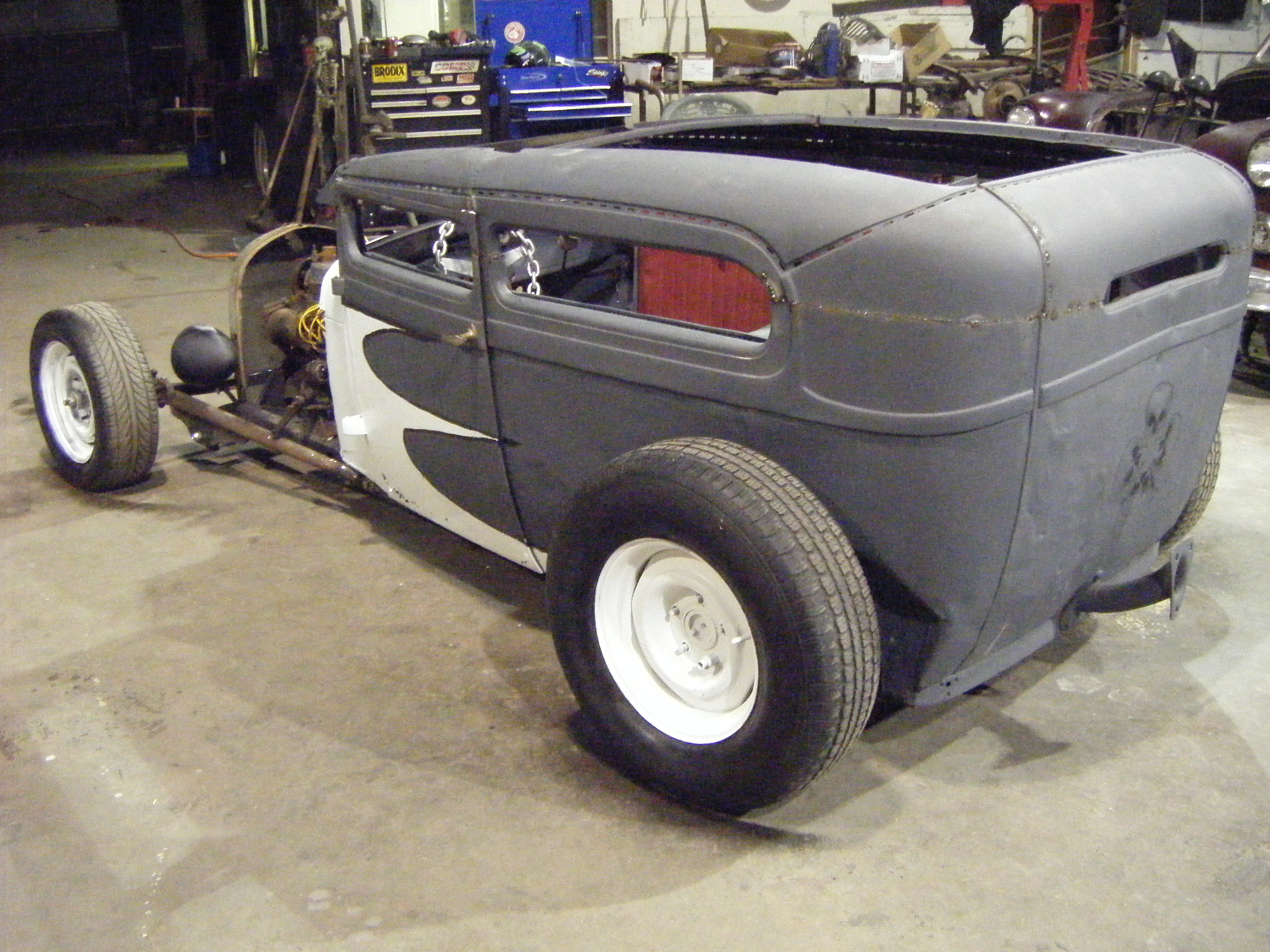 Ford Model A sedan built by Morbid Rodz that featured white scallops on a flat black finish. This car was shipped overseas and currently resides in Poland.